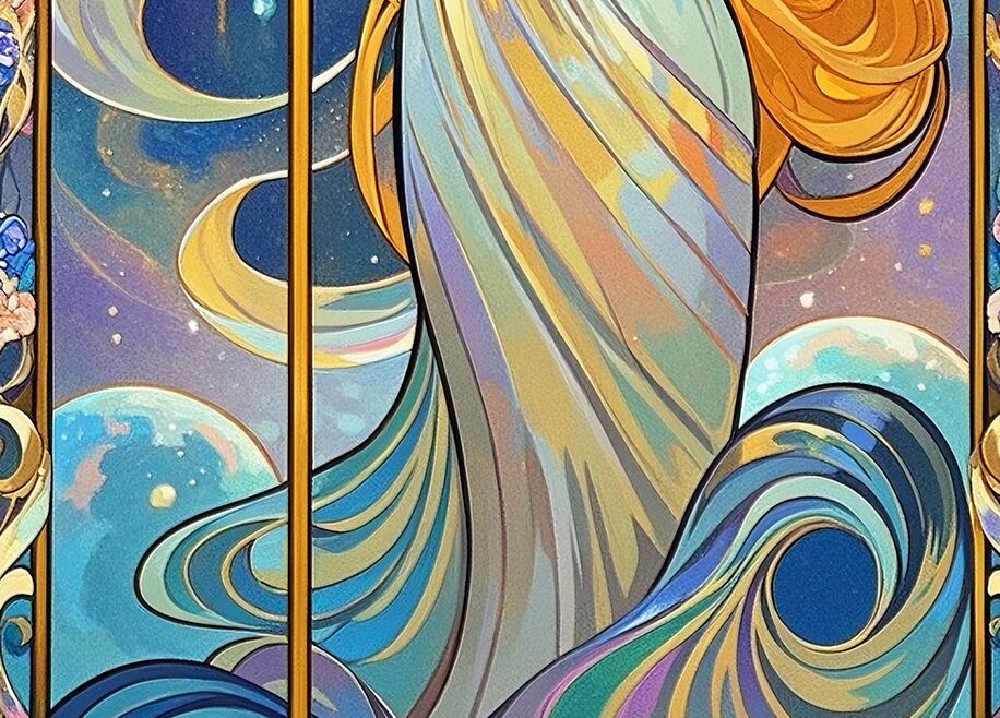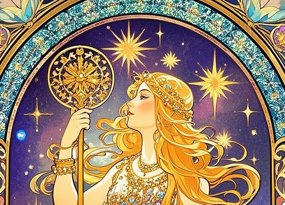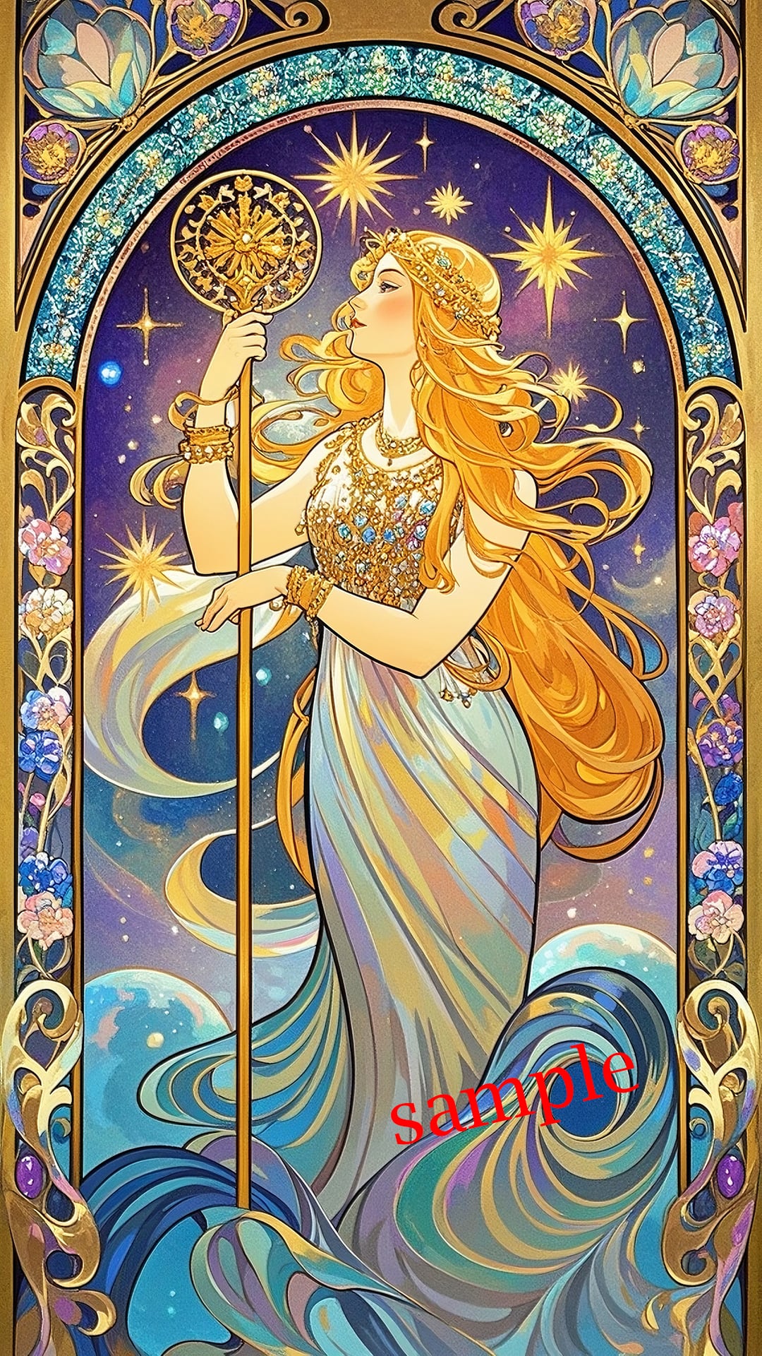 光輪と杖を象徴的に配した、守護と導きをテーマとした女神アートです。