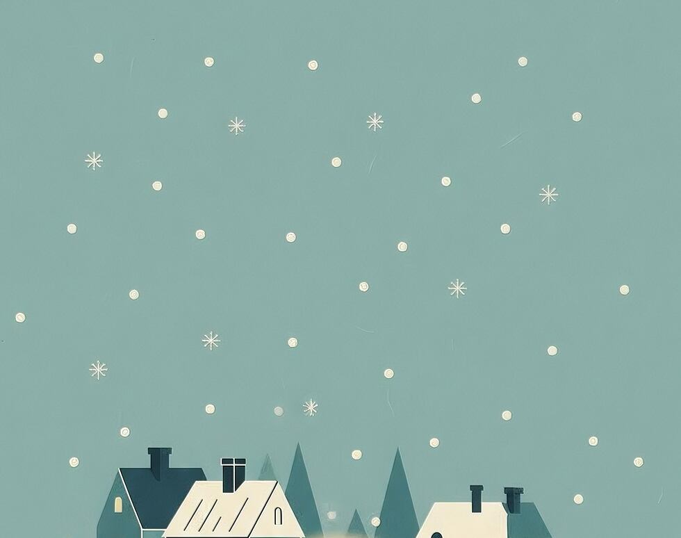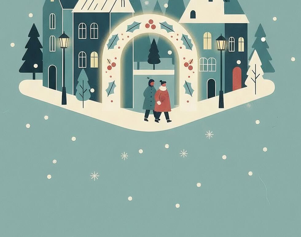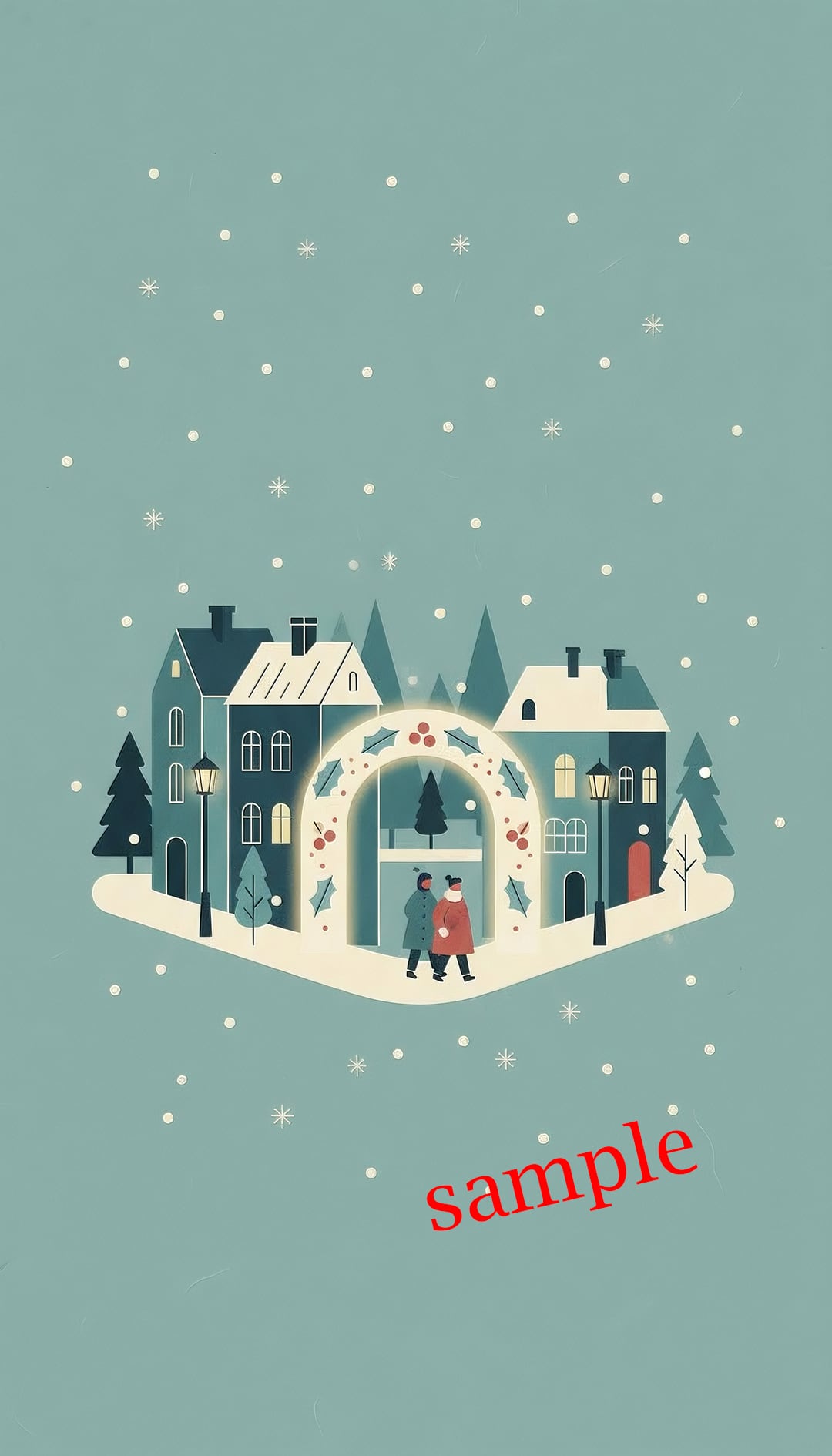 淡いグリーンを基調とした背景に、小さな街と人々を描いた、癒し効果の高い一枚です。