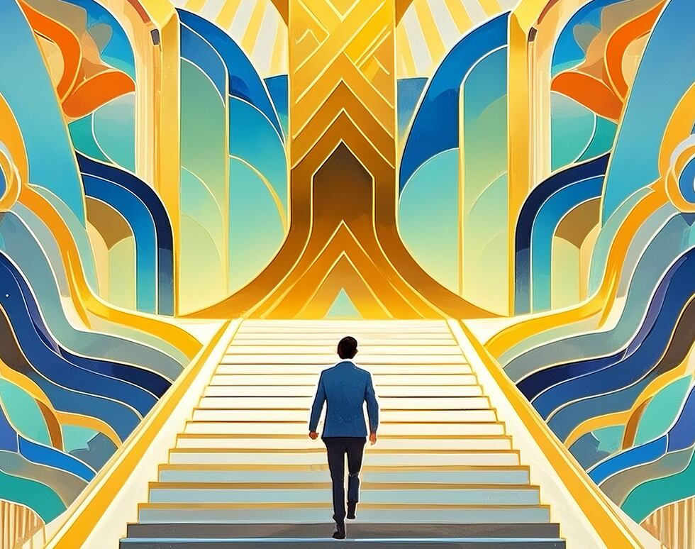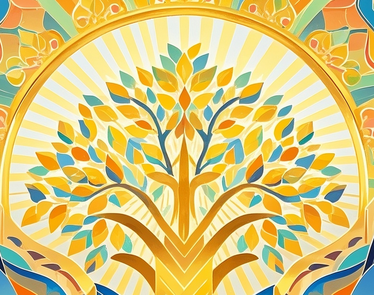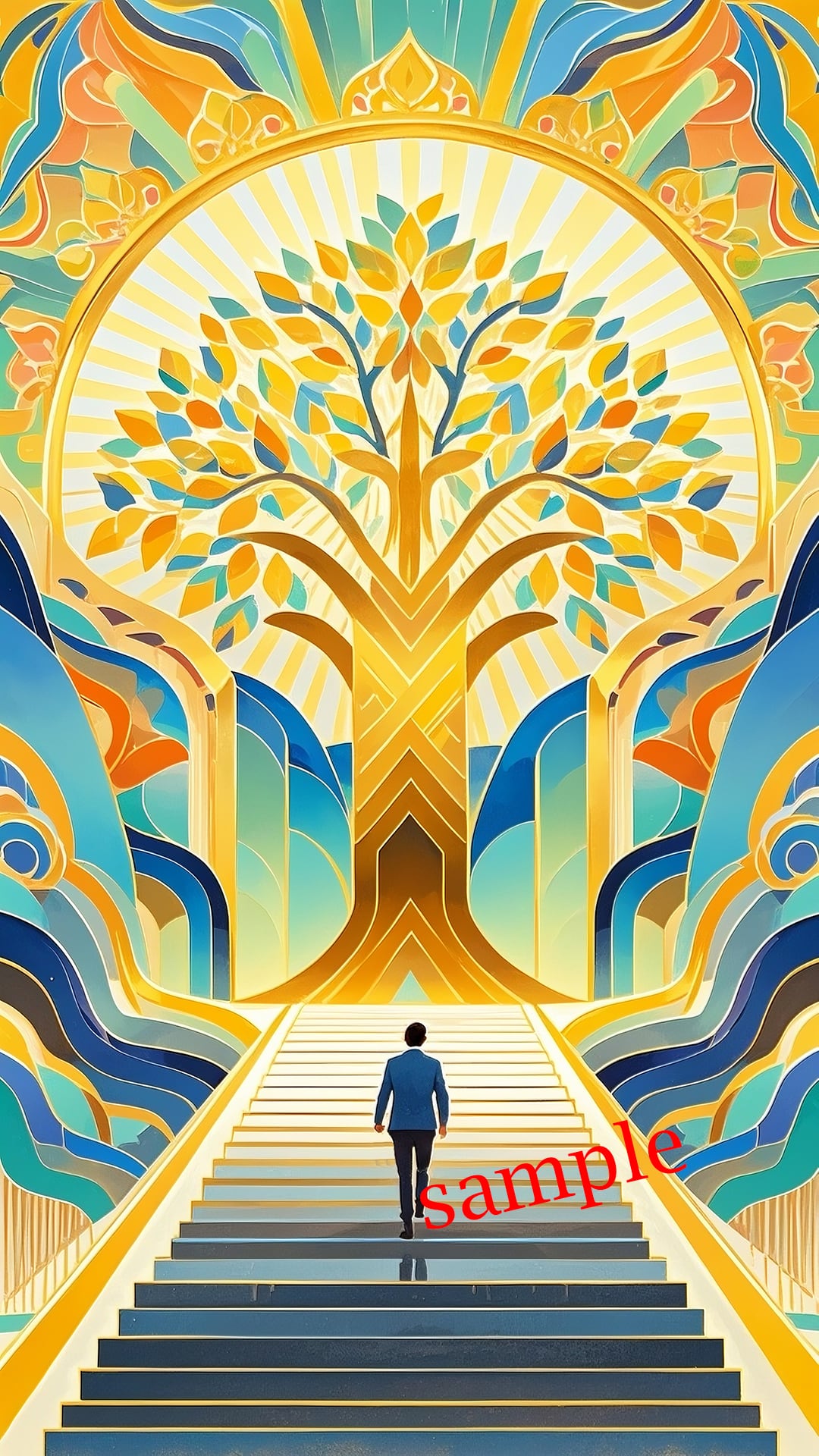 枝葉が四方へ伸びる姿は、人間関係や才能、運の広がりを意味し、足元から続く階段は努力が確実に実を結ぶことを表しています。