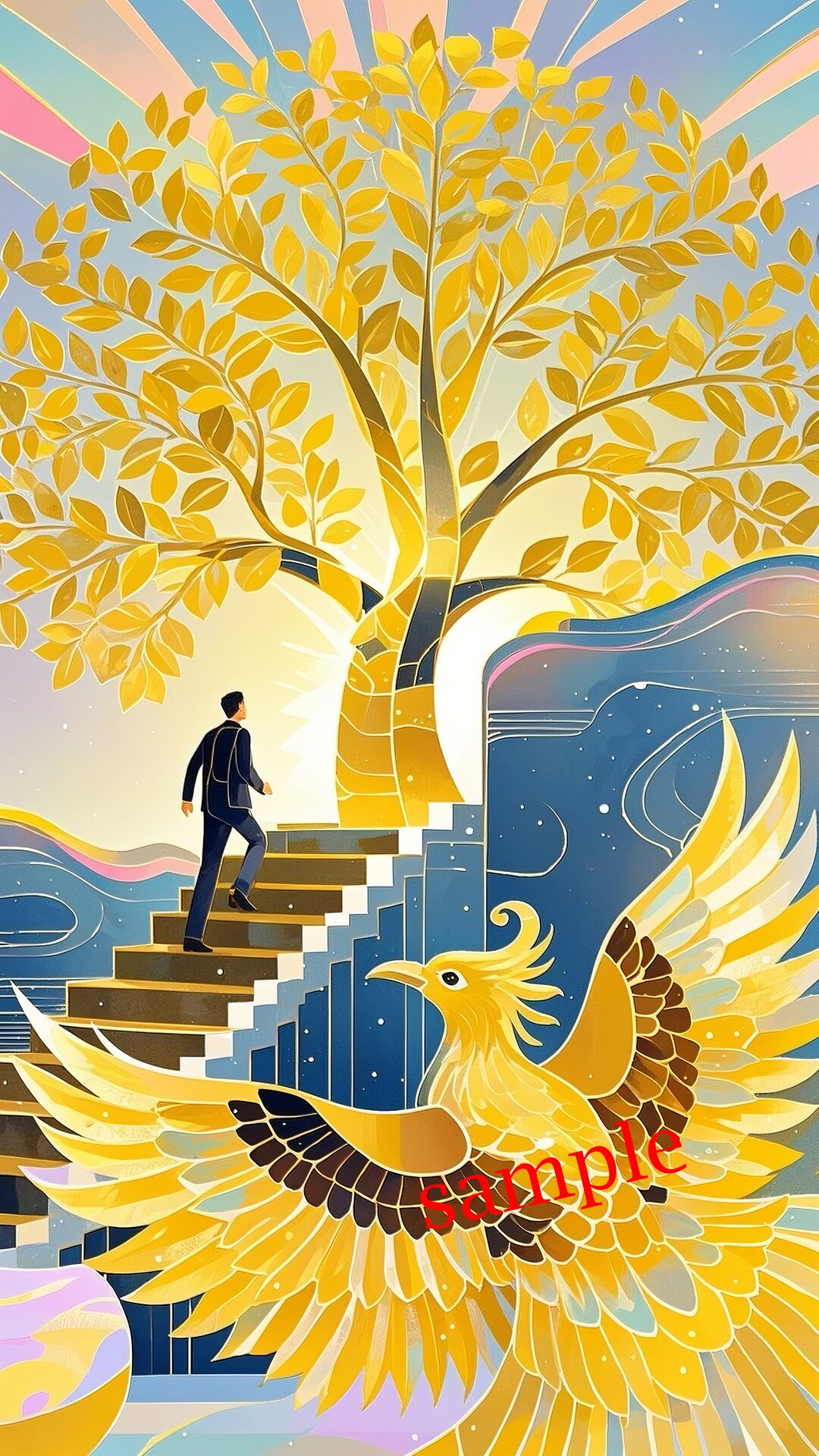 黄金色に輝く樹と鳳凰が共存する、調和と繁栄を象徴する一枚。