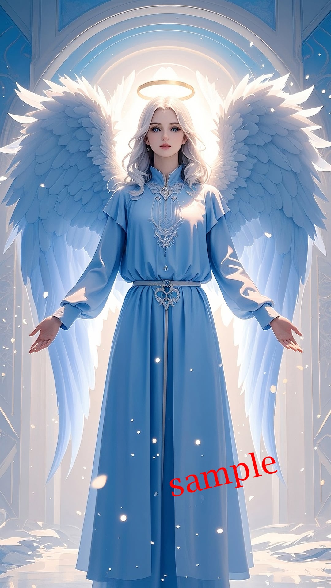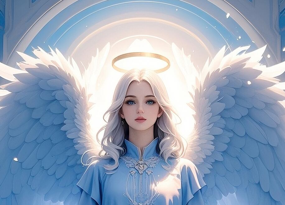 金色の光輪と白翼をまとい、調和と祝福を象徴する天使。