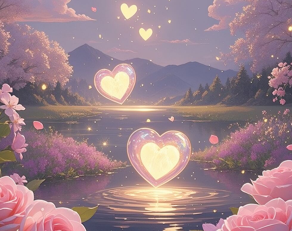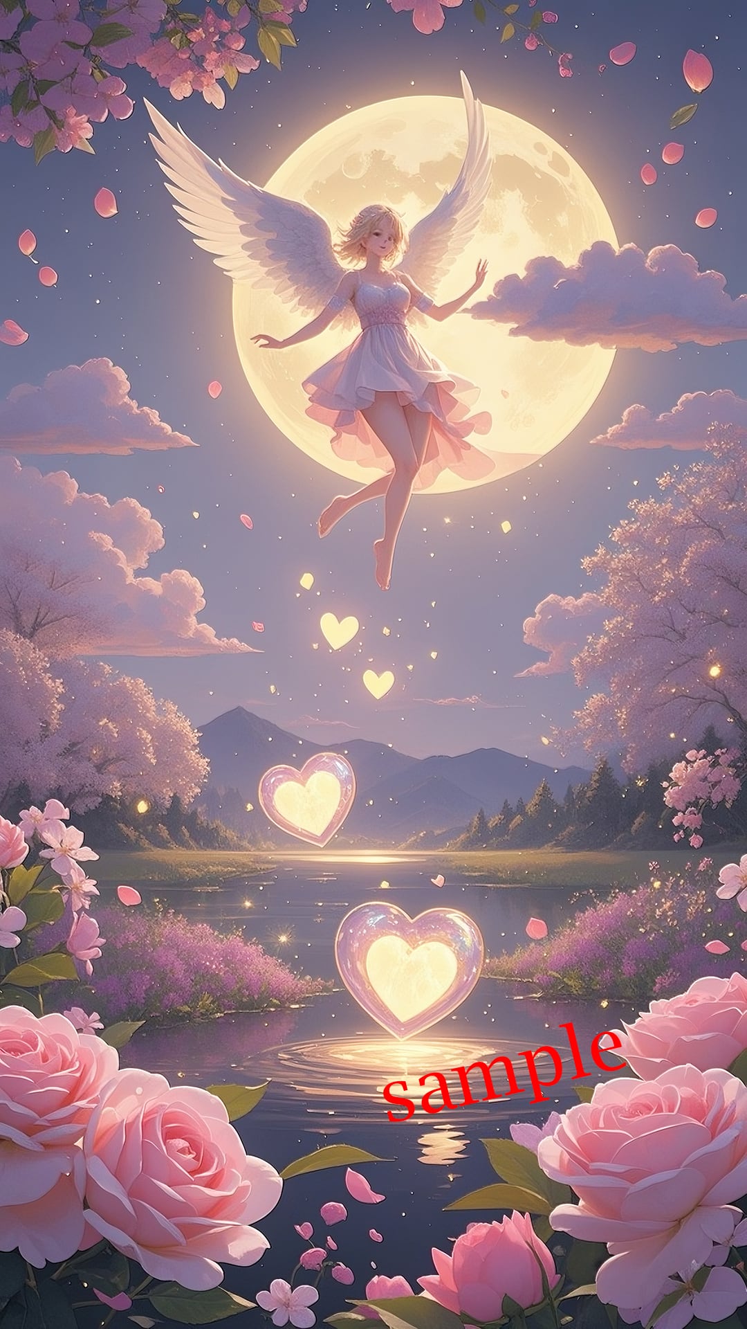 満月の光に導かれ舞い降りる天使と、湖面に浮かぶハートの光が印象的なスピリチュアルアートです。