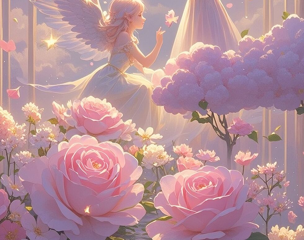 天使がハートの光を交わす姿は、絆・調和・祝福を象徴しています。