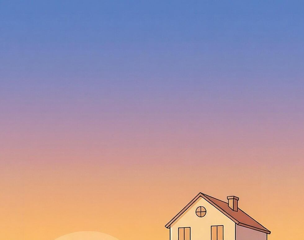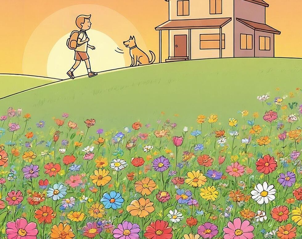 色とりどりの花が咲く丘と、穏やかに佇む家と愛犬を描いたスマホ壁紙です。
