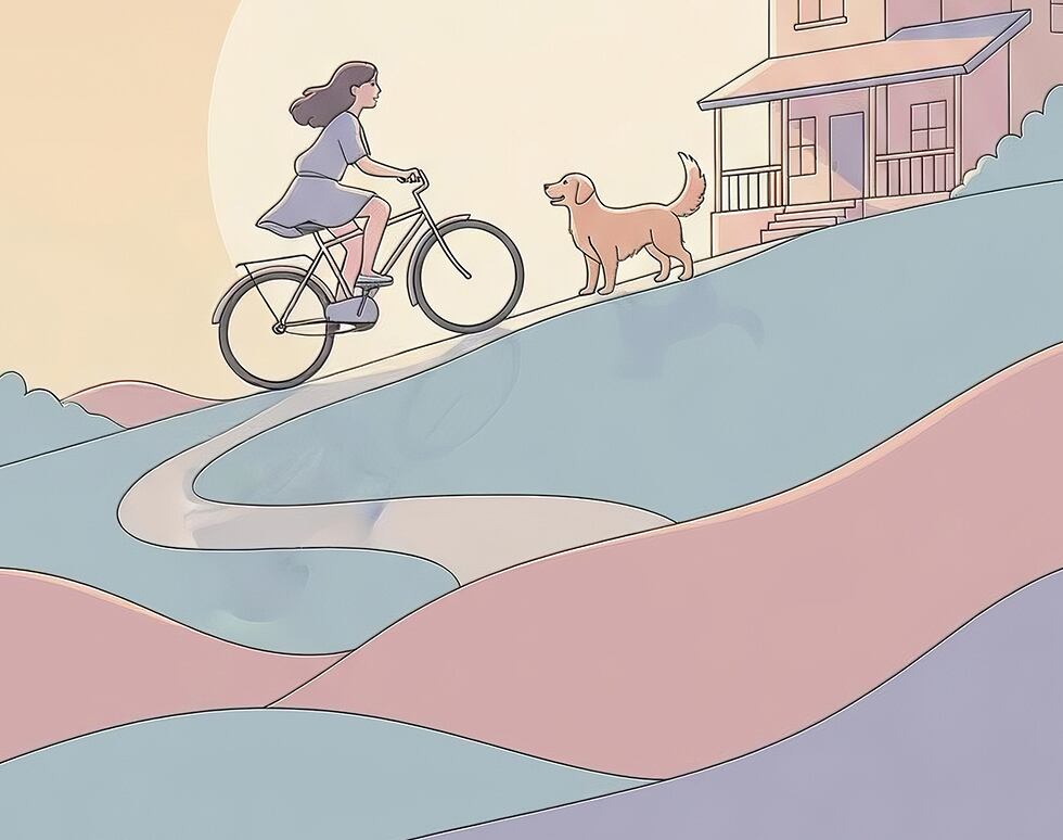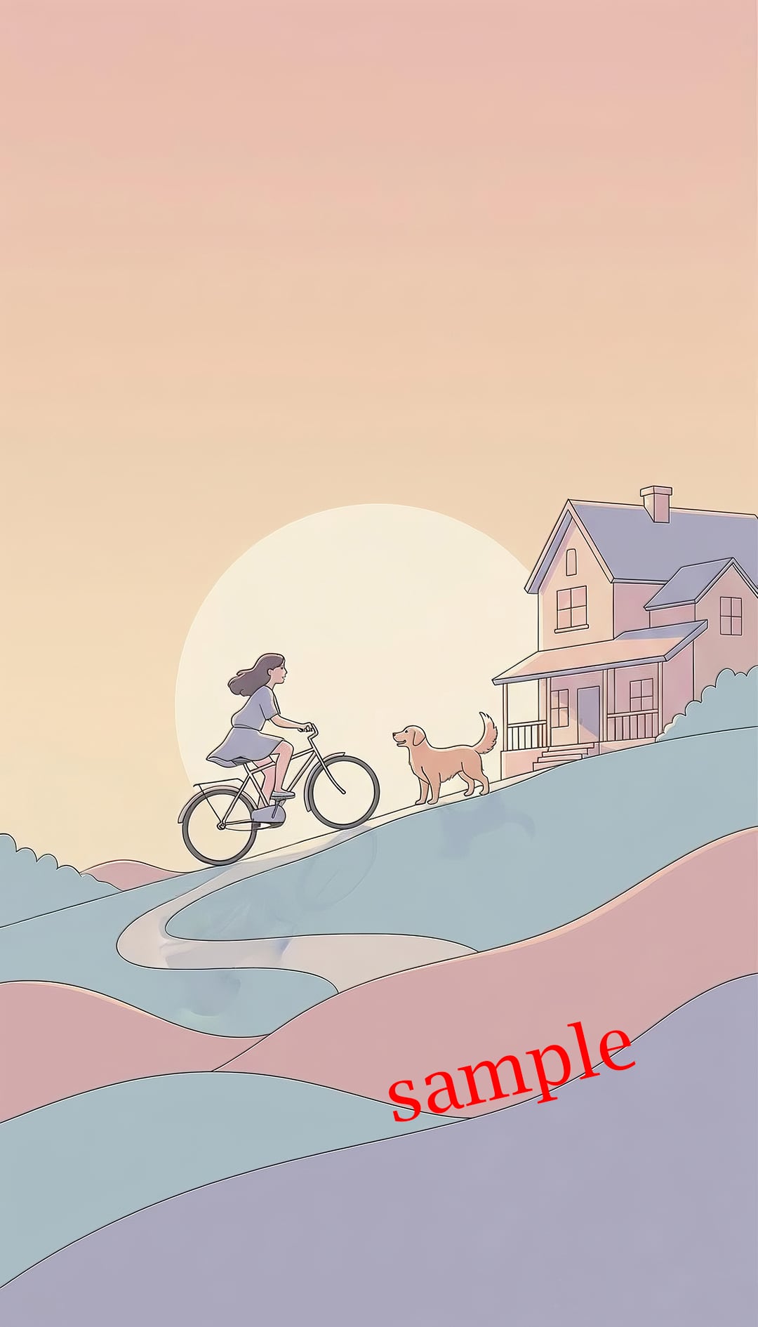 夕焼け空の下、坂道を進む軽やかな時間を描いたスマホ壁紙です。
