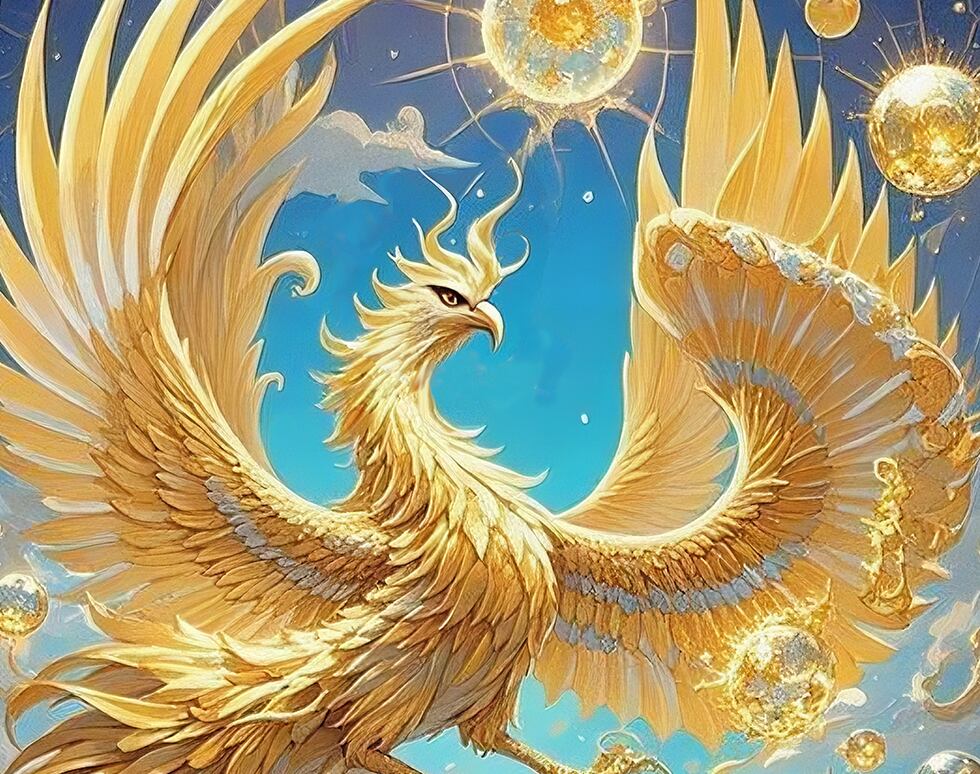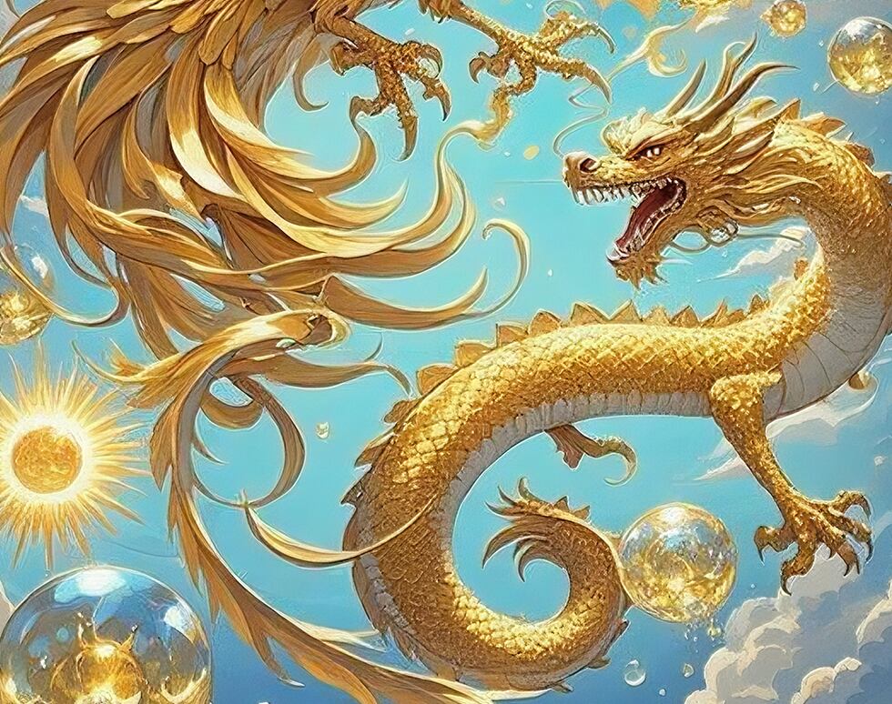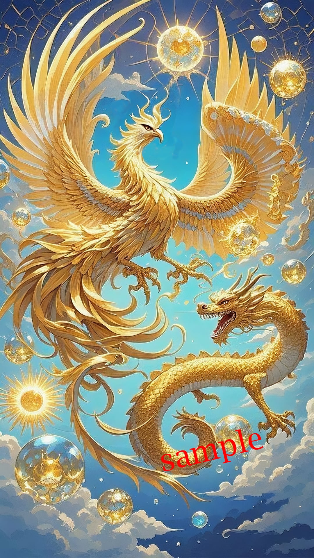 星々と光に包まれた龍鳳が、天からの祝福と繁栄を象徴する一枚。