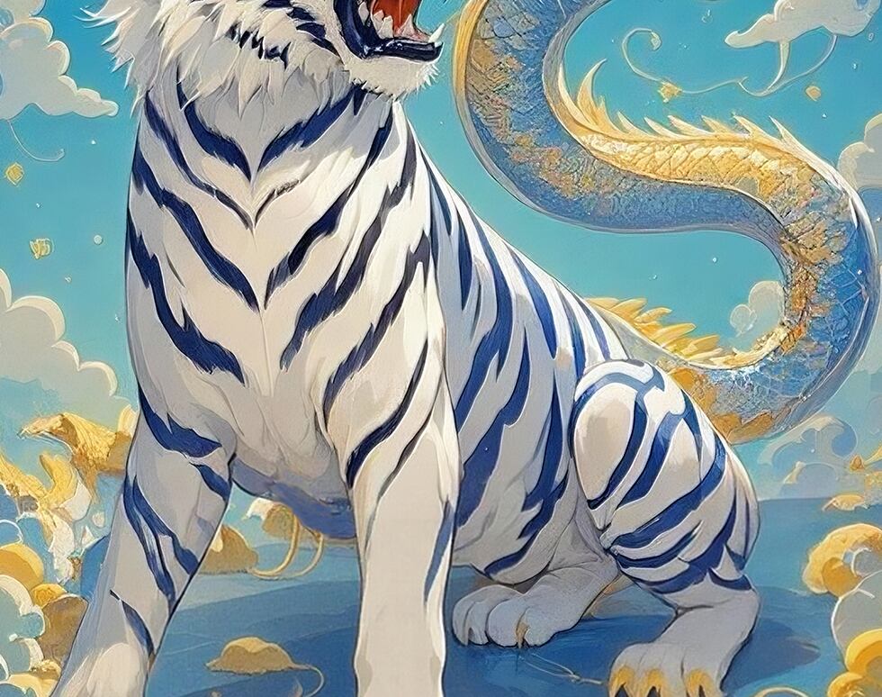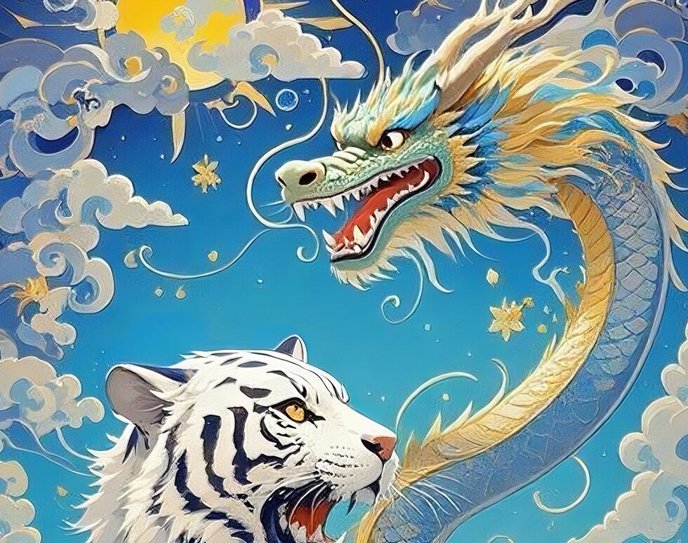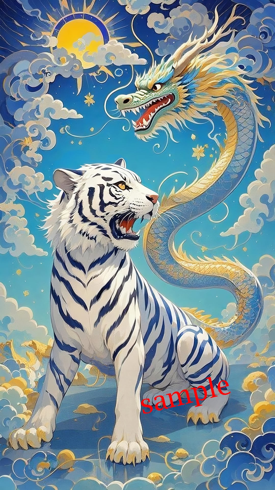 青空を背景に描かれた龍と白虎は、前進する力と勇気を象徴します。