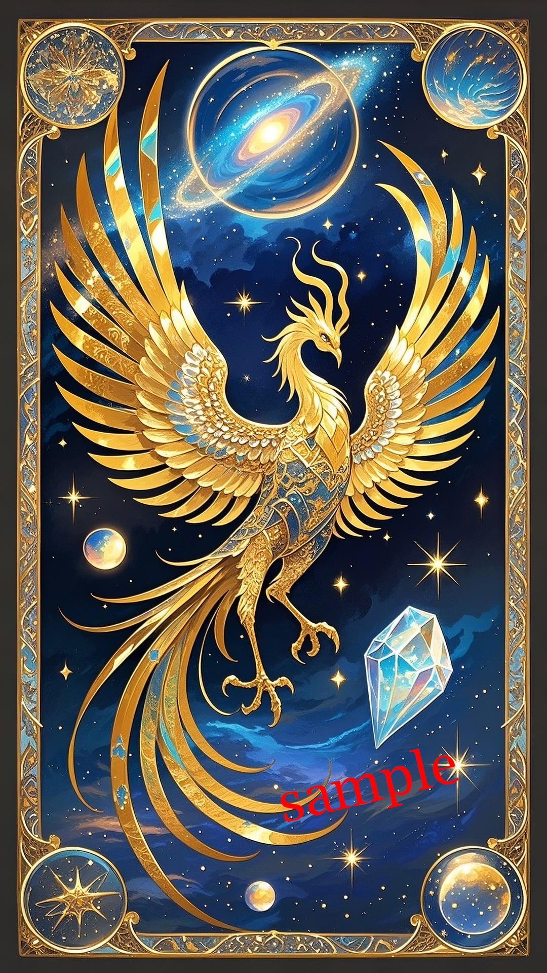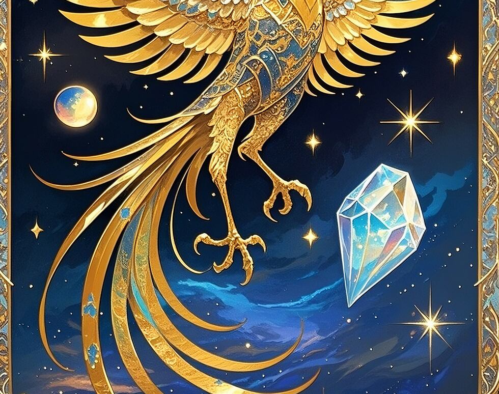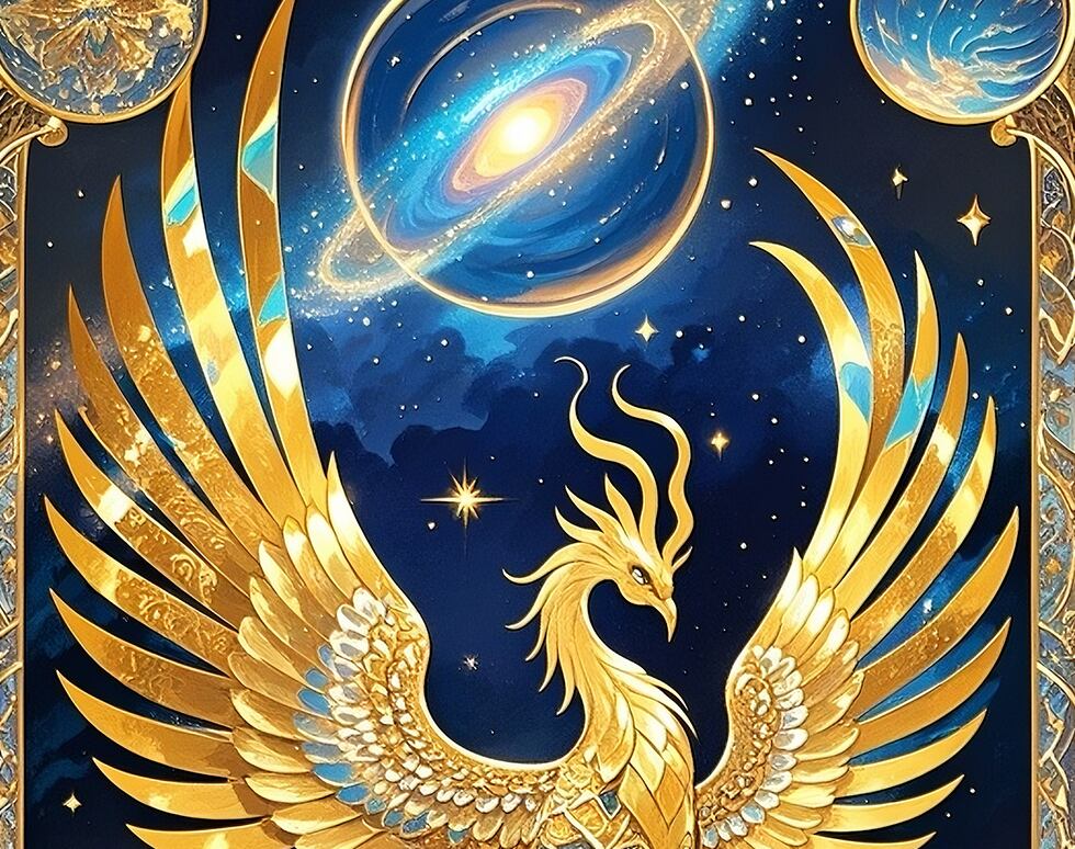 星々が広がる宇宙空間を舞う鳳凰は、魂レベルでの再生と覚醒を象徴します。