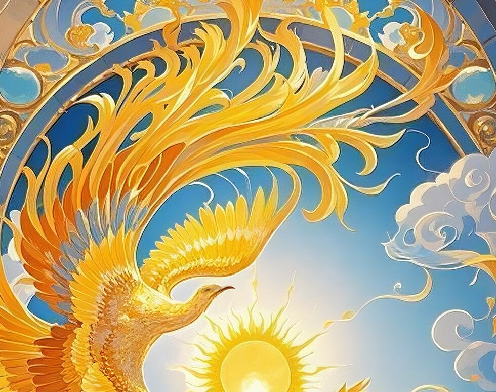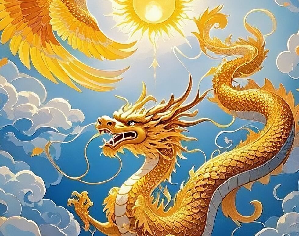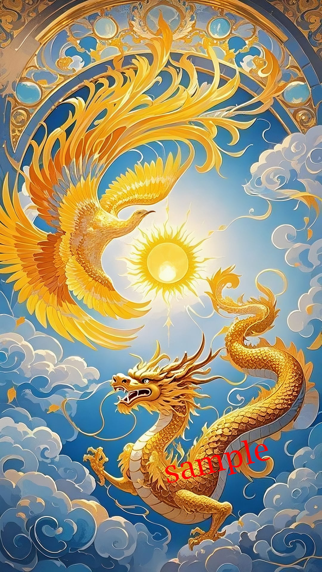 円環構図の中で舞う龍鳳が、運気の循環と上昇を象徴する一枚。