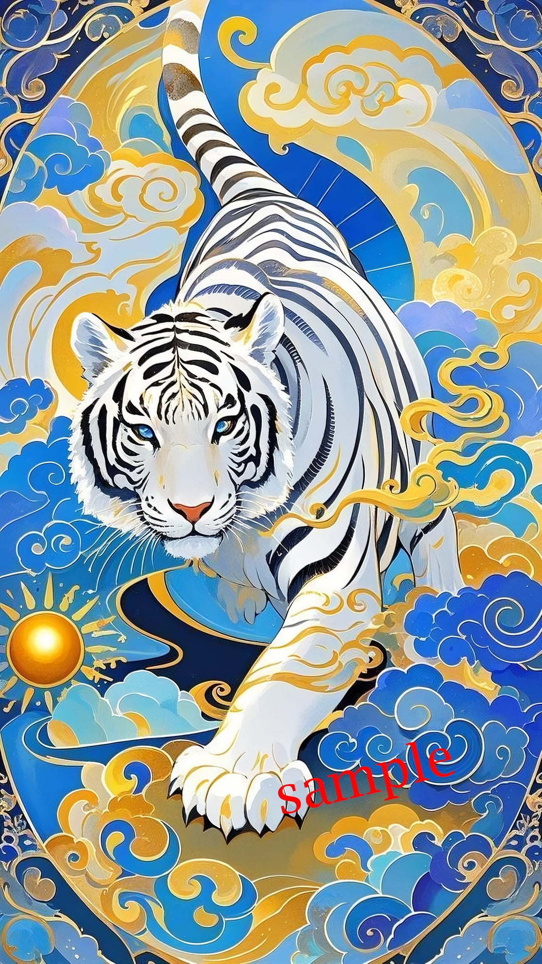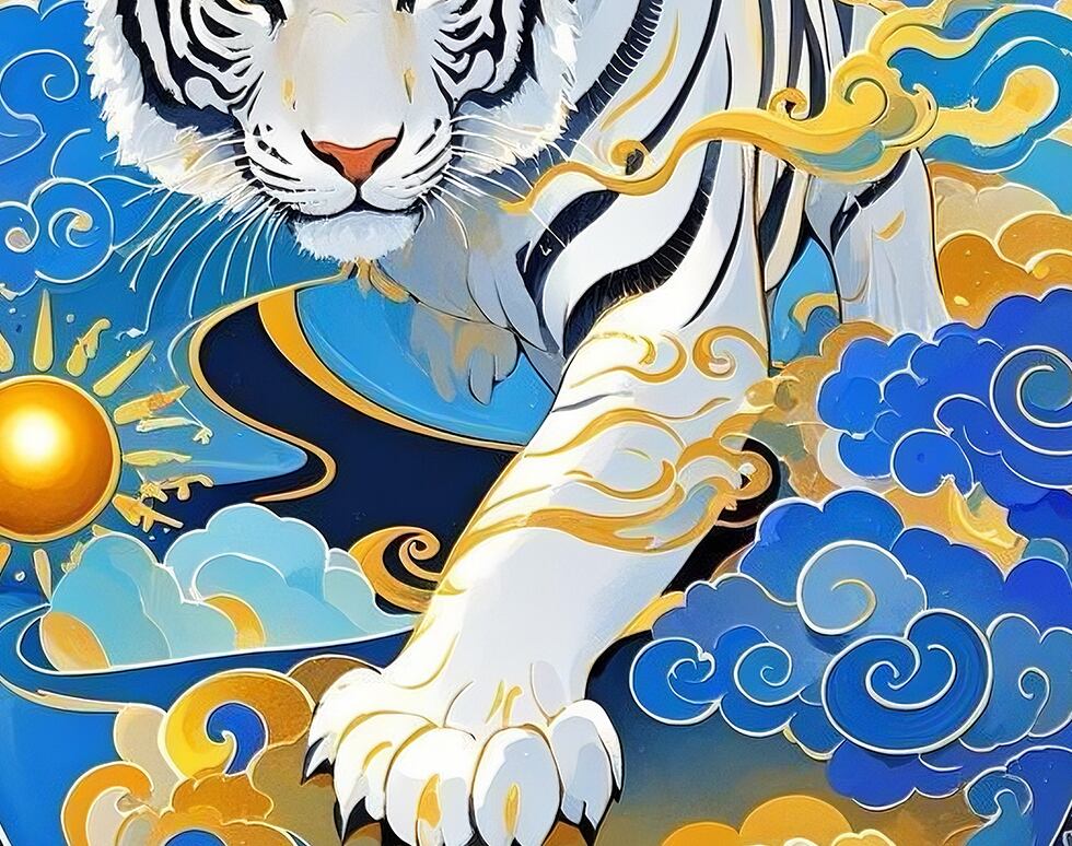白虎は四神思想において「西・金・決断・守護」を司り、迷いを断ち切る象徴とされています。前へ踏み出す構図は停滞を終わらせ、現実を動かすエネルギーを強めます。