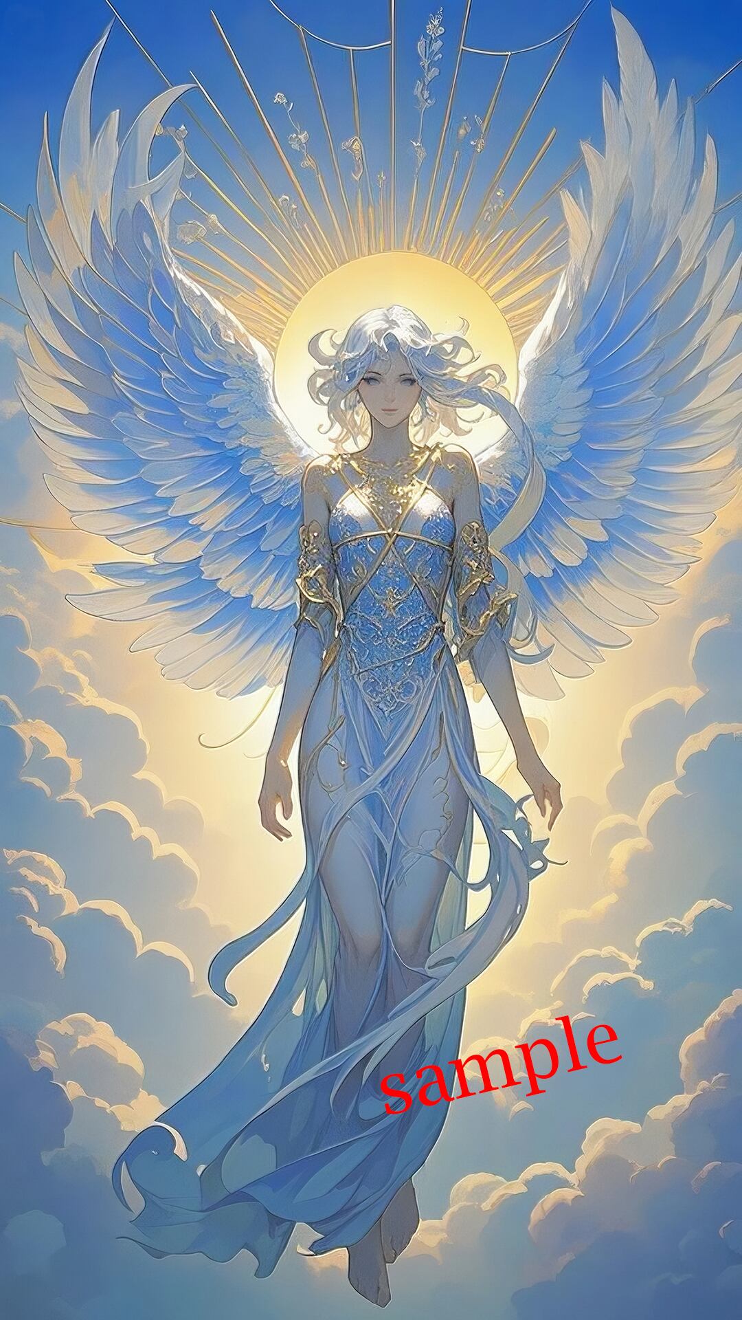 柔らかな光の中に立つ天使を描いた、静けさと癒しを感じるスマホ待ち受けです。