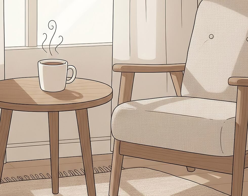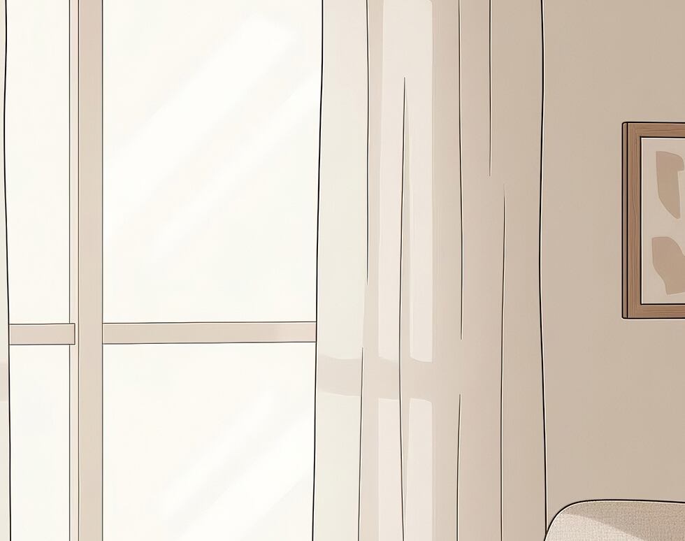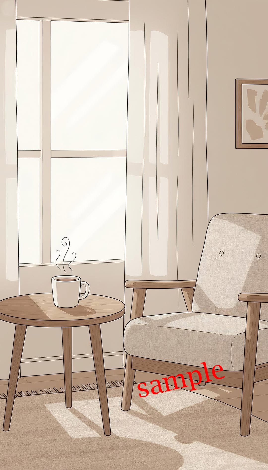 やわらかな朝の光が差し込む、静かなリビング空間を描いた壁紙です。