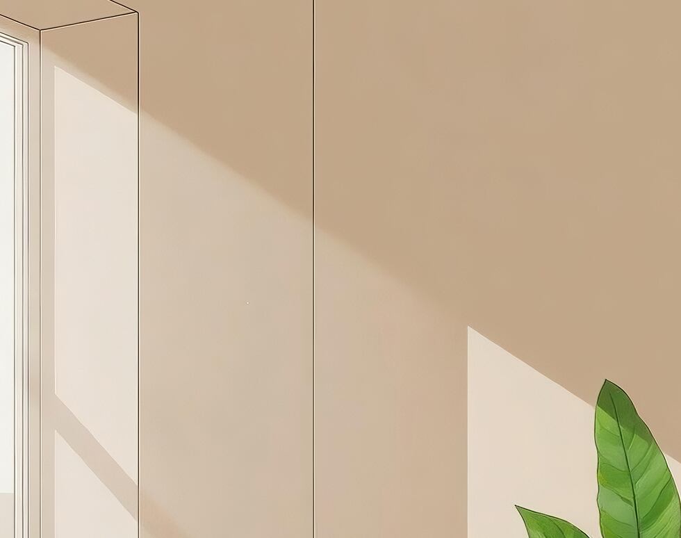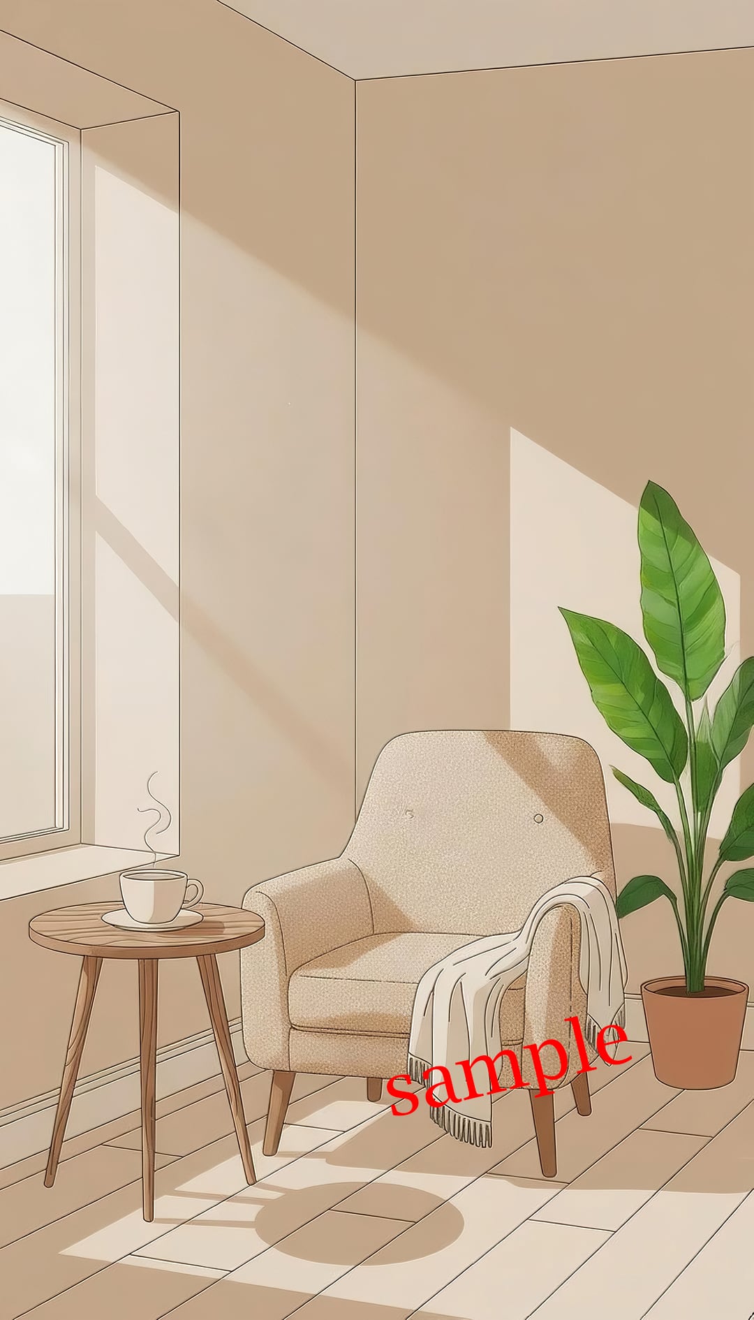 窓から差し込む光と、やさしく佇む植物を描いたスマホ壁紙です。