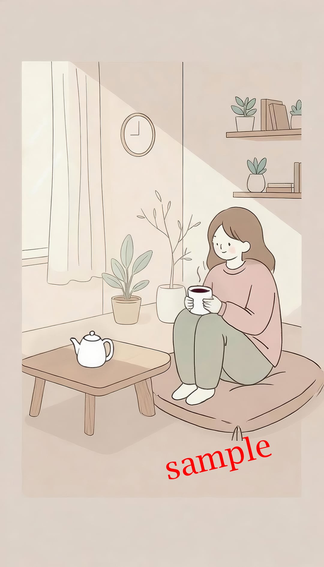 お茶を飲みながら過ごす、穏やかな室内時間を描いたスマホ壁紙です。