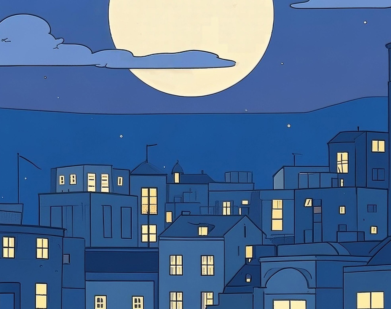 眠りにつく街と満月を描いたスマホ壁紙です。