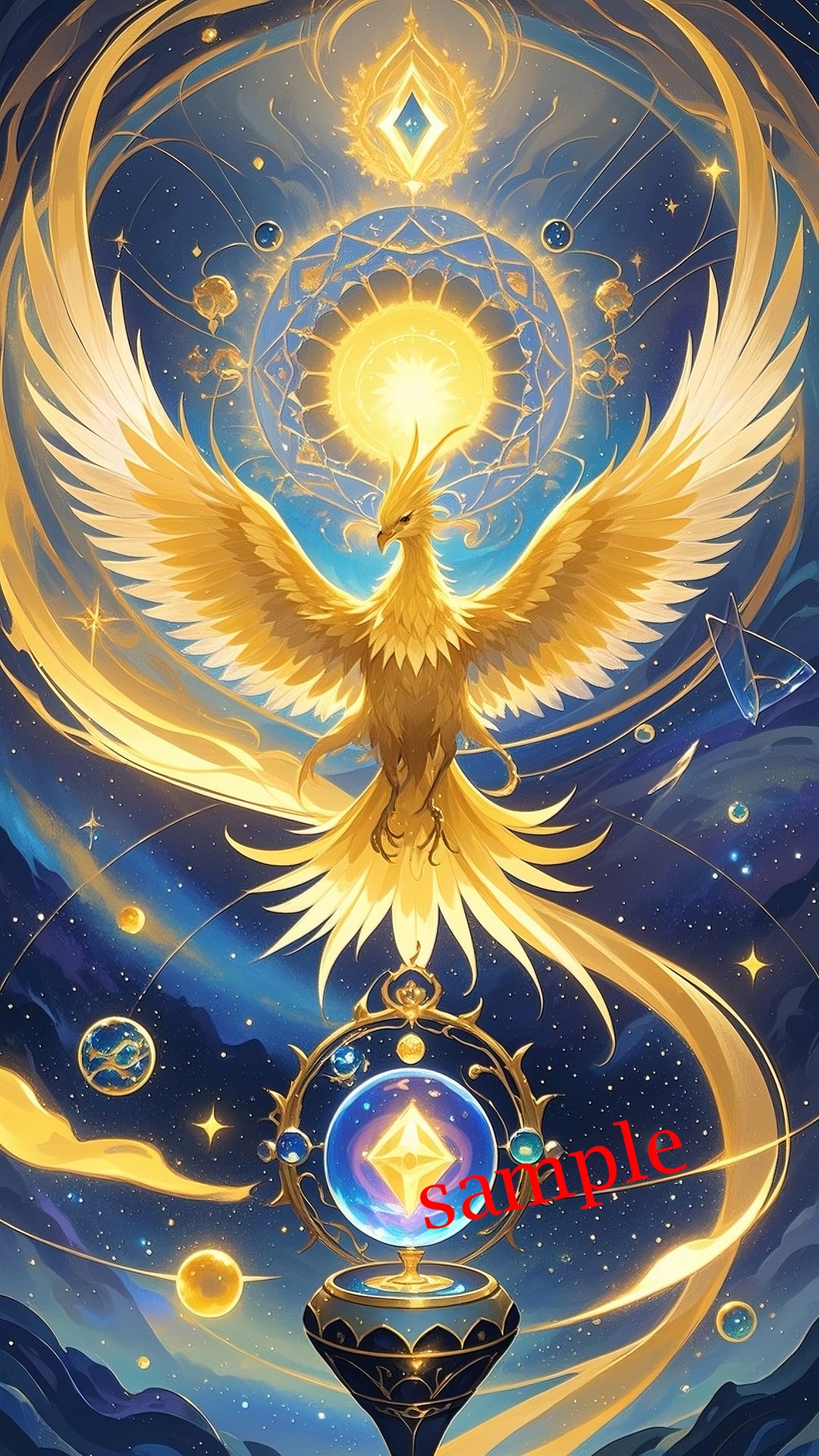 スピリチュアル的に「中心に光がある構図」は、精神の安定とエネルギーの統合を意味します。鳳凰は高次の存在と繋がる象徴とされ、直感やインスピレーションを高めたい方に最適。金と青の配色は、冷静さと情熱のバランスを整え、ブレない判断力を育てる効果が期待されます。