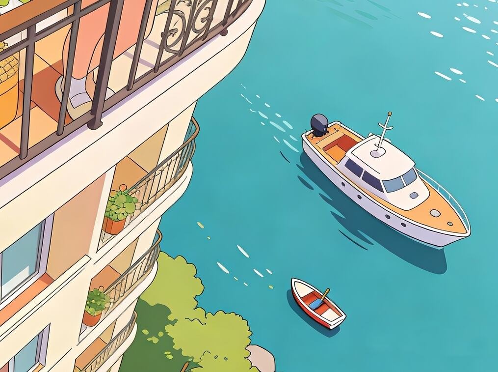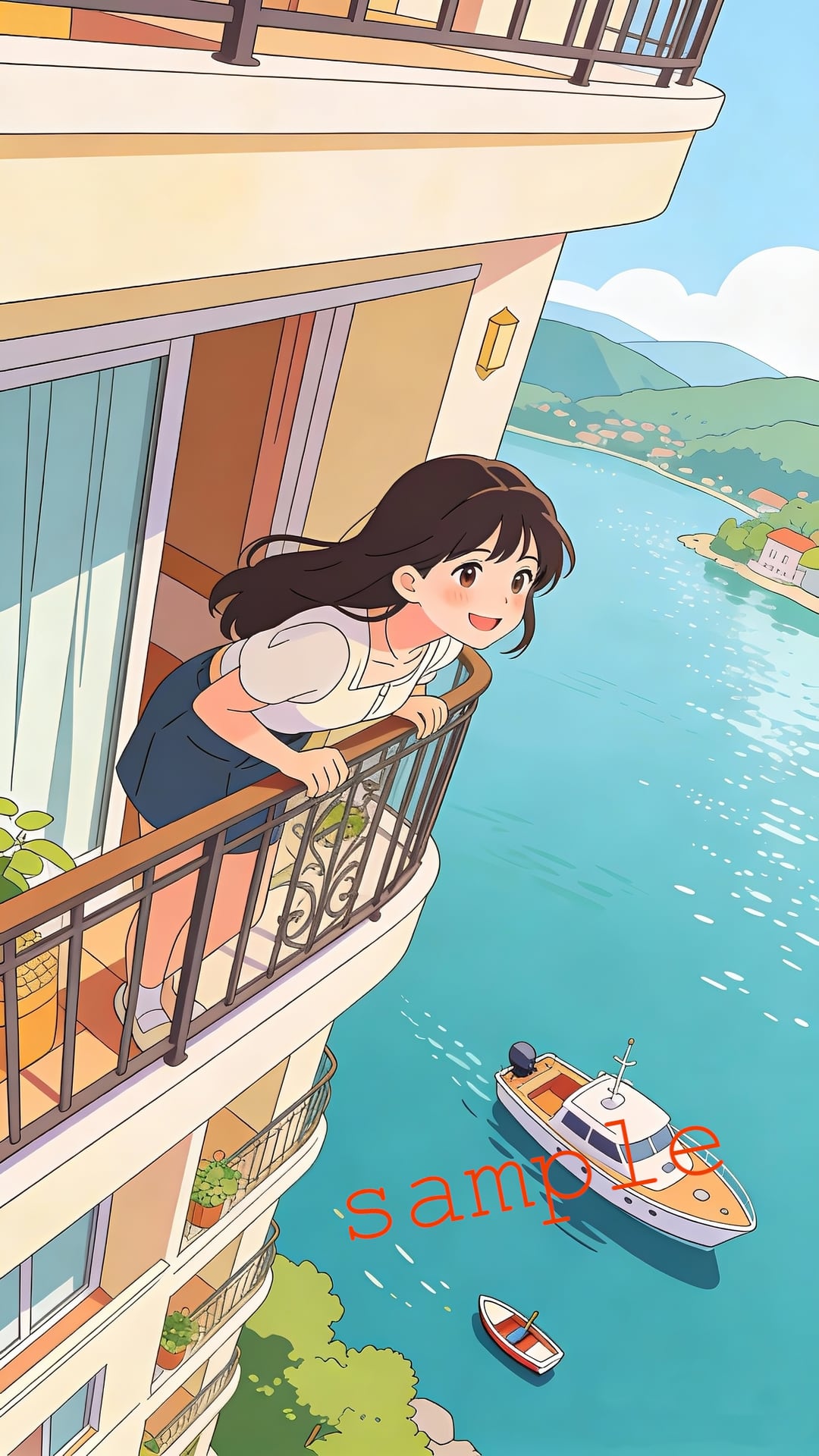 静かな湖を見下ろすバルコニーに立つ少女を描いた一枚。